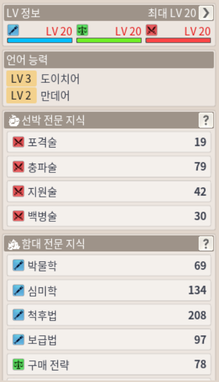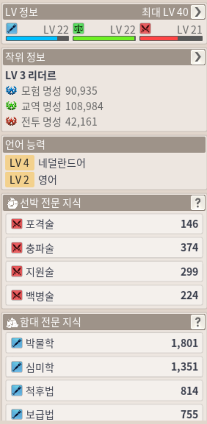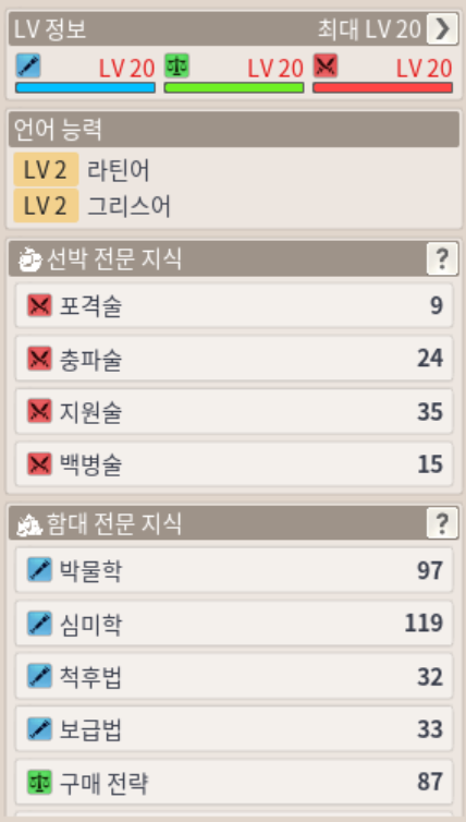 주특기가 조금 다를지라도, 20레벨 B급 항해사의 두번째 능력치인 심미학 > C급 항해사의 가장 높은 수치인 심미학을 웃도는 것을 확인할 수 있습니다.