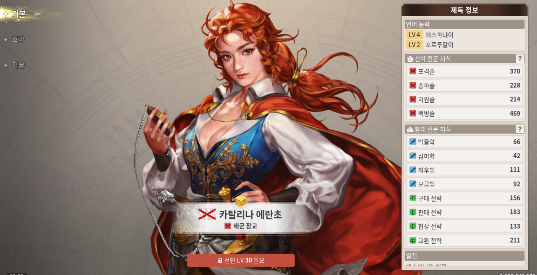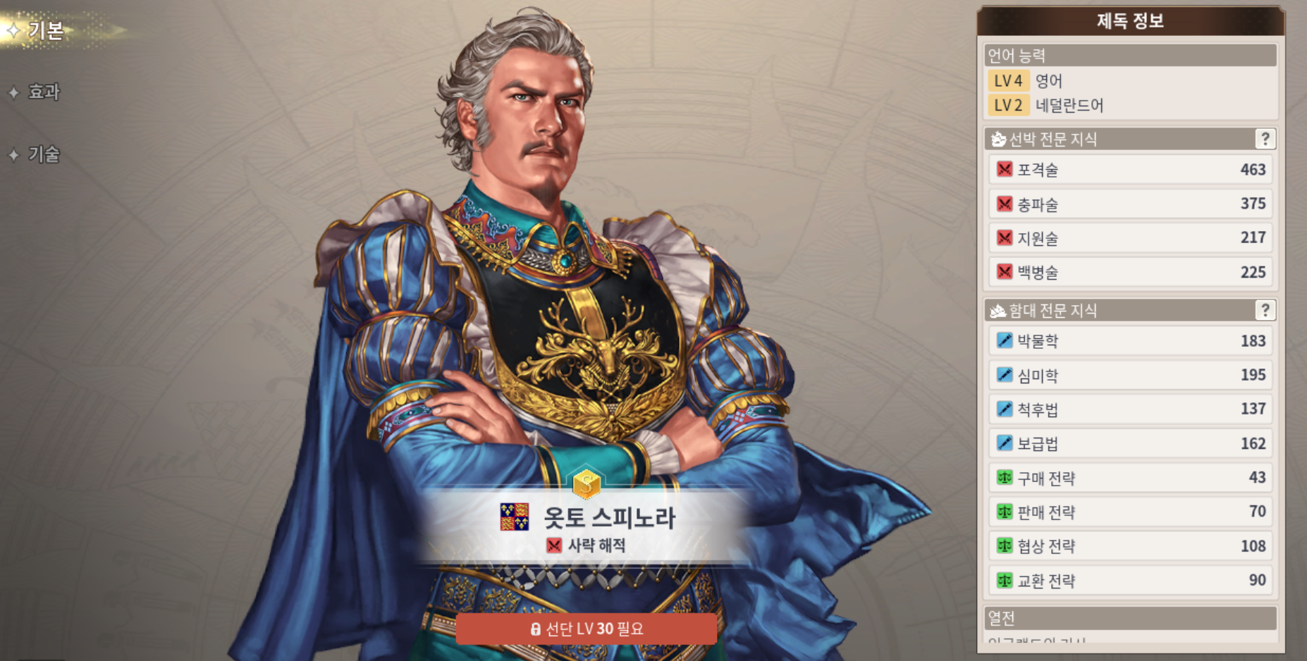 S급 제독캐릭터 에르네스트 로페스 능력치, B급 항해사 마르틴 베하임 능력치, C급 조반니 라무시오 능력치