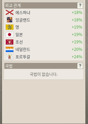 여기에 국가 호감도를 100% 를 찍으면 추가 관세 혜택 5% 가 더 들어갑니다. 5위 국가 유저가 1위나 2위 국가와 호감도를 100% 찍은 경우라면 , 해당 국가의 항구에서 무려 15% 의 혜택을 받을 수 있다는 계산이 나옵니다. 이게 상당히 무시 못하는 것이 2위 국가인 에스파냐, 스페인을 비교해보면, 거의 10% 의 세율밖에 안된다는 겁니다. 부담이 굉장히 많이 줄어듭니다.