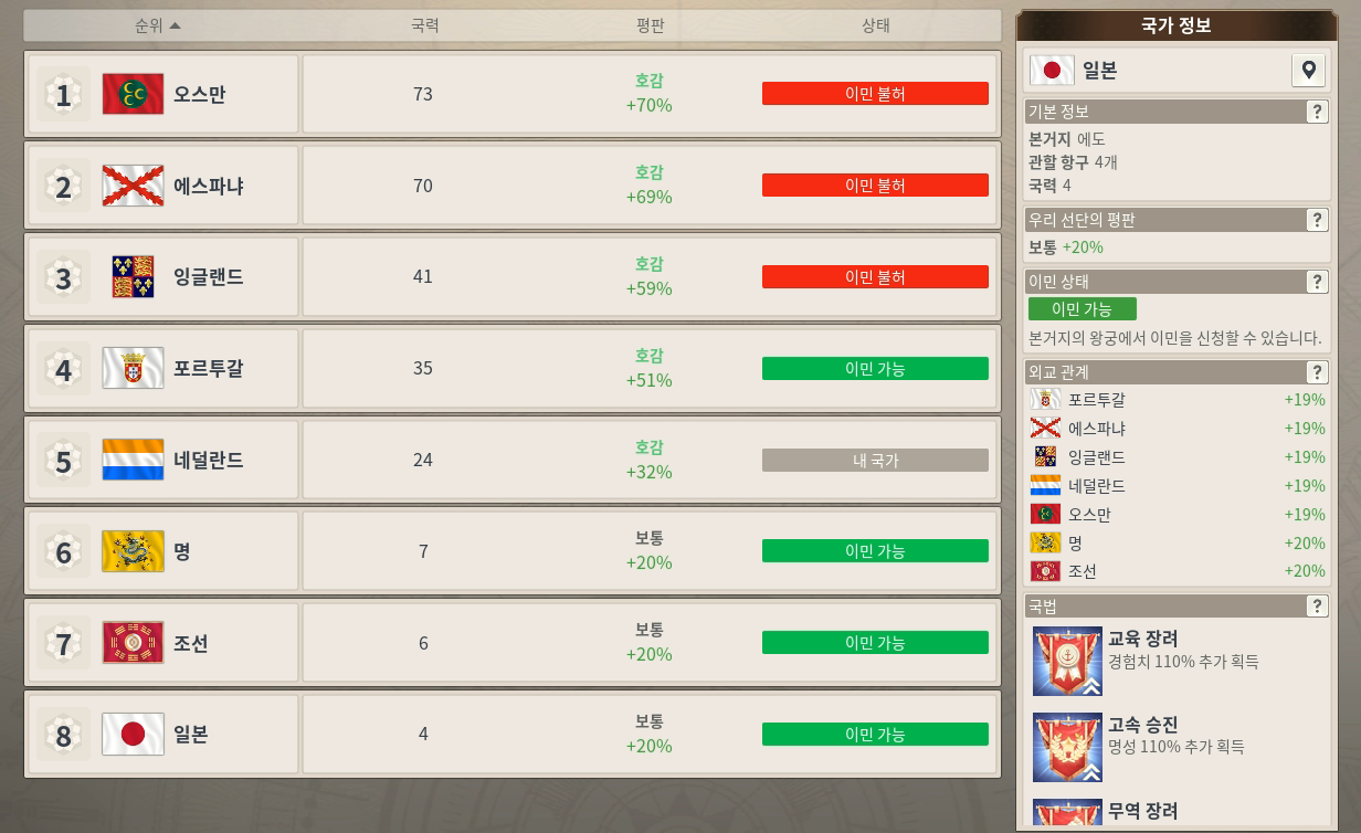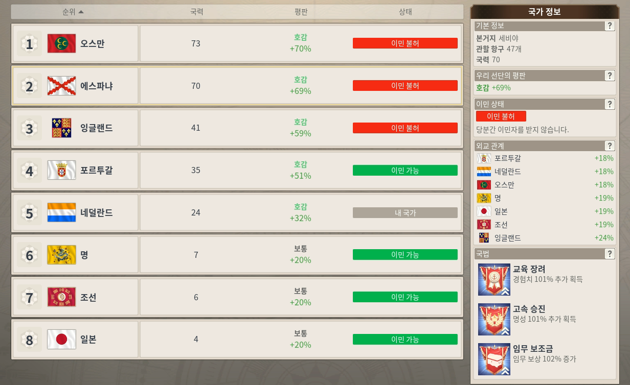 업데이트가 된 날자를 기준으로 태평양 1서버의 경우 국가 순위는 오스만, 에스파냐, 잉글랜드, 포르투갈, 네덜란드 순위이며 아직 입항이 불가능한 동아시아의 명,조선, 일본이 각각의 순서입니다.