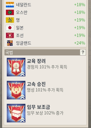 이제는 조금 2위보다 괜찮은 3위 입니다만 그래도 아쉬운 것이 많이 보입니다. 역시 마찬가지로 1, 2% 단위의 상승과 관세 인하만이 있을뿐이며. 그나마 보급 지원으로 자국 항구에서 보급시 보급비용 10% 의 혜택이 있습니다.
