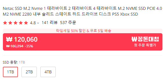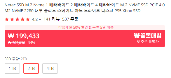 핫딜 할인이 끝나기는 했지만, 그럼에도 알리익스프레스에서 판매하고 있는 제품들을 확인할 수 있습니다. 글을 작성하는 날짜를 기준으로 하여, 각각 1TB 12만원 2TB199,000원이라는 가격에 구매가 가능하며. 2TB 제품의 경우 위 금액으로 구매를 하면 , 150달러 이상의 제품이기에 세관에서 추가 세금을 납부해야 함으로. 지난번과 마찬가지로 확대를 떴을 때 150달러 미만으로 구매 하시는 것을 추천드립니다. 달러 환율 계산이 귀찮다 하시면 그냥 15만 원 미만으로 구매하시면 됩니다.
