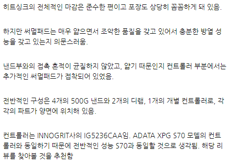 솔직히 말해, 직접적으로 사용하기에는 조금 안정성에 대한 걱정이 있습니다. 여러가지 성능과 리뷰를 봤을 때 확실하게 NVMe4.0의 성능을 제대로 뽑아내고 있는 제품임에는 틀림이 없지만, 안정성이죠.