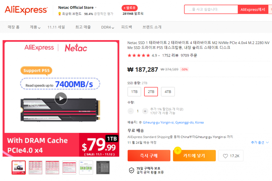 정말 대란 터졌다. 라고 해도될 정도의 가성비 Nvme SSD 딜이 떳었습니다. 저는 이 소식을 늦게 접했다는 것이 아쉽긴 하더라구요. 무엇보다 Netac Nvme NV7000 의 가장 큰 메리트는 가격이었습니다. 세계적으로 유명한 NVME 브랜드들의 2TB 제품 가격들이 380~400 달러, 국내에서 1TB 제품들이 20~24만원 정도에 판매된다는 것을 생각해보면 2TB 제품이 무려 18만7천원에 판매되는 것도 놀랍지만. 광군절 프로모션 과 자체 할인 이벤트, 카카오페이 할인 이 가능했는데.