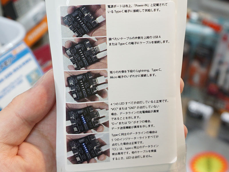 기판 위의 커넥터에 케이블 한쪽을 (USB Type-A또는 C)꽂고, 기판 하단의 커넥터에 케이블의 또 한쪽 (USB Type-C, microUSB, Lighning의 어느)를 꺾어서 반대쪽을 꽂아주면, 기판 중앙에 있는 5개의 LED(CC, D+, D-, VCC, GND)가 점등/소등, 케이블의 상황을 체크하여 사용할 수 있다.