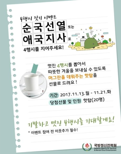 2017년 11월 13일 국방부 산하 국방정신전력원에서는 '순국선열' 또는 '애국지사'로 4행시를 만드는 이벤트를 진행했는데, 당연하지만 국방부, 현역 병사들의 처우, 대우가 좋지 않은 것을 이용하여 온갖 비꼼을 4행시로 만들면서 시작 되었다.