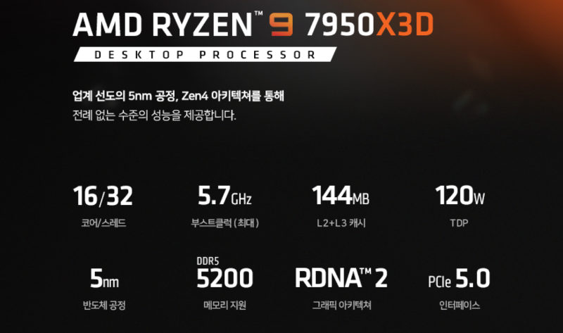 | Ryzen 7 7800X3D | 8C/16T | 5GHz | 4.2GHz | 96MB | 120W |
