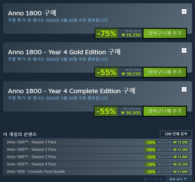 안타깝게도 이미 게임을 가지고 계신 분들이라면 스팀을 통해서 아노 1800 / Anno 1800 골드에디션/ 컴플리트에디션 4년차 팩 구매가 불가능합니다. 아예 게임을 가지고 있지 않은 분들만 4주년 골드에디션 , 4주년 컴플리트에디션을 구매하실 수 있습니다. 아…… 이게 말이 되나? 싶은데 유비소프트가 이렇게 판매를 하고 있습니다.