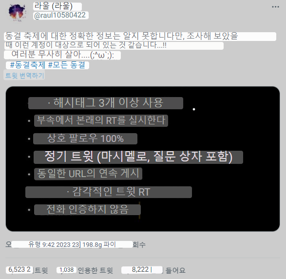 딱히 글을 작성하지는 않았고, 1달에 한번정도의 이벤트성 리트윗 정도..? 정보, 뉴스 스크랩? 그리고 특히 7번, 전화번호 인증 을 통한 실명, 본인 인증을 하지 않았다- 하는 것이 좀 큰 것 같습니다.