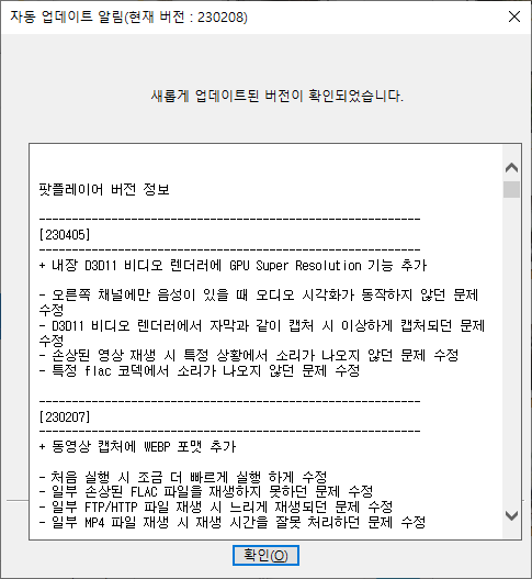 팟플레이어 230405 버전 업데이트 가 진행 되었습니다. 2달만의 230405 업데이트에서 가장 대표적인 기능 업데이트는 D3D11 비디오 렌더러 소프트웨어 에 GPU 슈퍼 레졸루션 기능이 추가되었으며, 그외 오디오 및 비디오 문제 수정 기능이 업데이트 되었습니다.