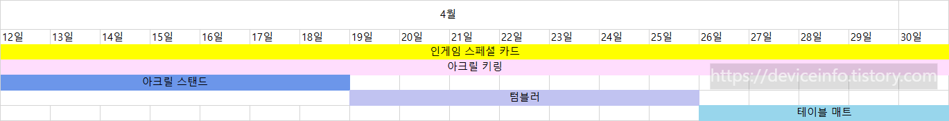 원신 피자알볼로 굿즈의 기간을 보기 편하시라고, 표를 만들어 봤습니다.