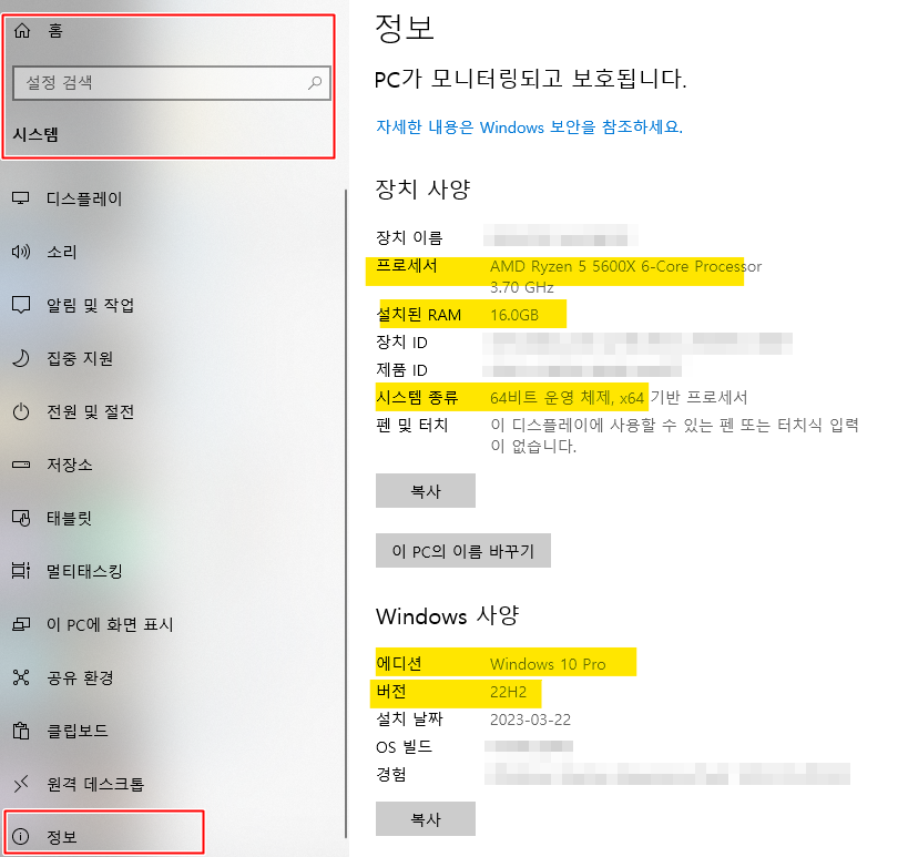 '시스템 → 정보' 로 이동하면, 아래와 같은 화면이 나옵니다.