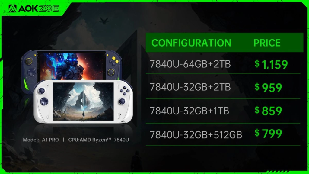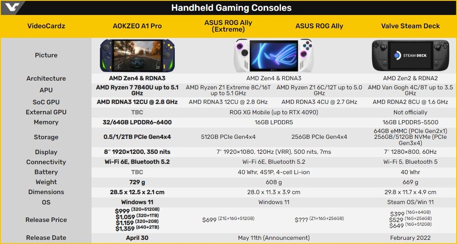 AOKZOE, R7 7840U 은 핸드헬드 게이밍 디바이스로, 내장 그래픽 Radeon 780M 코어와 LPDDR5X-6400 메모리를 탑재했습니다. 벤치마크R23 로 측정한 CPU 성능은 6900HX 나 I7-12700H 와 비슷하며, 그래픽카드 성능은 RTX 2050과 GTX 1650 Ti 사이입니다. 크라우드 펀딩을 진행중이며, RAM 메모리는 32GB 또는 64GB 를 선택할 수 있습니다.