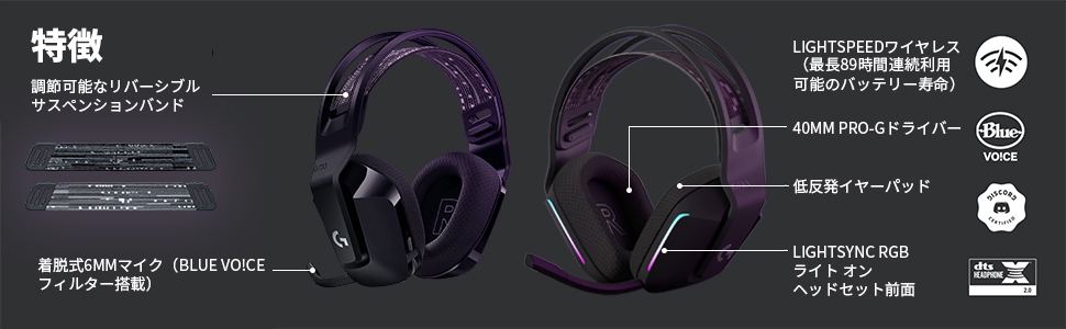 G733r은 컴퓨터나 게임 콘솔과 2.4GHz 무선(USB-A LIGHTSPEED 무선 수신기)으로 연결하는 오버헤드형 헤드셋입니다. 이번 리뉴얼로 배터리 효율이 향상되어 연속 사용 시간이 최대 89시간(LED off)으로 크게 늘어났다고 합니다. 무게가 278g으로 가볍고 착용감도 좋은 점을 어필하고 있습니다. 헤드밴드에는 양방향으로 사용할 수 있는 서스펜션 밴드가 탑재되었으며, 이어컵에는 형태 기억 소재를 채택했다고 합니다. 머리를 흔들어도 미끄러지지 않고 주변의 소음을 차단할 수 있을 정도의 착용감을 구현했다고 하네요.