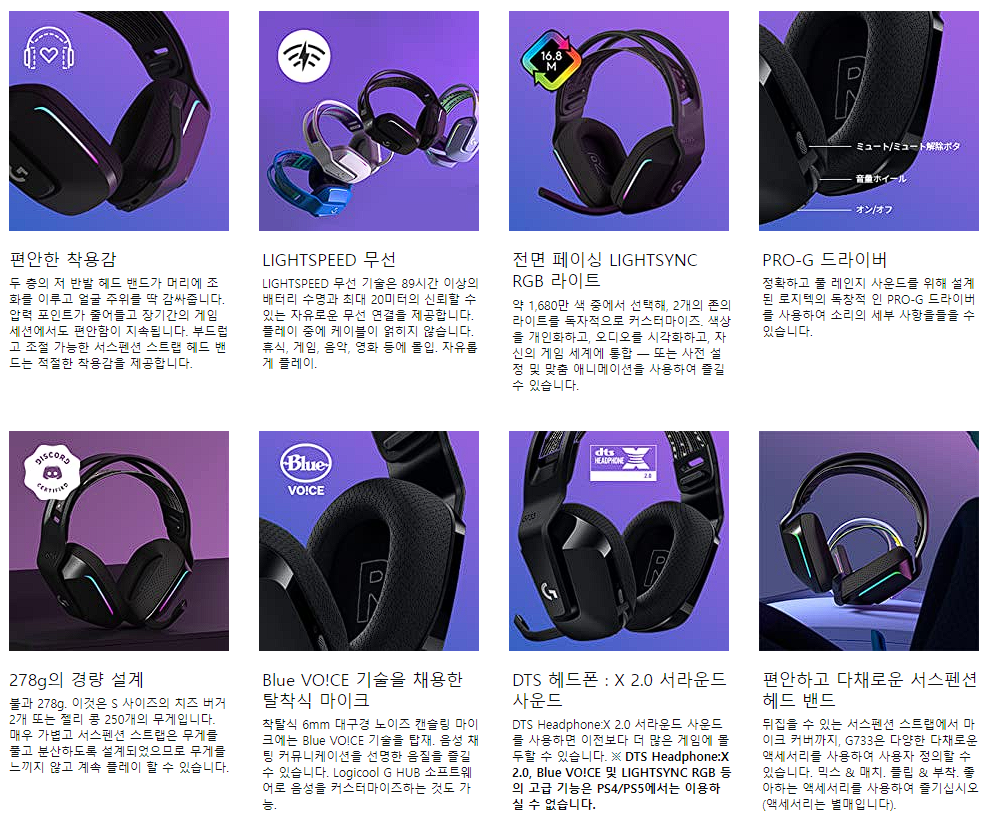 로지텍 무선 헤드셋 G733-BKr 은 자체무선 기술인 LIGHTSPEED 를 사용하여 지연이 적고 안정적인 연결성을 제공한다고 합니다. 20m 범위에서 통신할 수 있으며 헤드셋을 착용한 상태로 자리를 비울 수도 있다고 하네요. G733-BKr 의 크기는 너비 190×깊이 88×높이 180mm입니다. 마이크(단일 지향성)는 분리 가능합니다. Windows 7 이상, macOS 10.12 이상을 탑재한 PC, PlayStation 4, Nintendo Switch 에서 사용이 가능하며, 구성으로는 로지텍 무선 헤드셋 G733r 전용 무선 수신기, USB 충전 케이블 등 입니다.