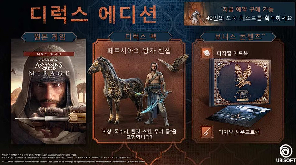 어쌔신 크리드 : 미라지 디럭스 에디션 (Deluxe Edition) 은 10달러 비싼 $59.99 에 출시되지만 게임 본편과 더불어 디럭스팩이 탑재된다고 합니다.