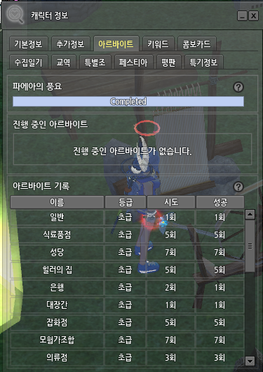 캐릭터 창의 아르바이트 탭 정보가 개선되었습니다. 여기에서 '파에아의 풍요'에 대한 세부 정보를 확인할 수 있으며, 현재 진행 중인 아르바이트의 진행도를 확인할 수 있습니다. 또한, 모든 아르바이트 유형의 시도 횟수와 성공 횟수를 확인할 수 있게 되었습니다.