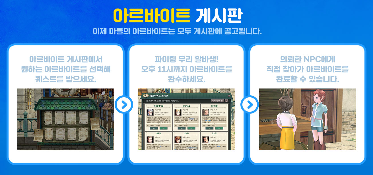 이제부터 마을에 새롭게 배치된 게시판에서 각 마을 NPC의 아르바이트를 받을 수 있습니다. 게시판은 아르바이트 인원 수가 가득 찼거나 수주 가능 시간이 아닌 경우 해당 아르바이트를 나타나지 않고. 게시판을 통해 아르바이트 세부 정보를 확인하고 손 쉽게 아르바이트를 선택할 수 있습니다.