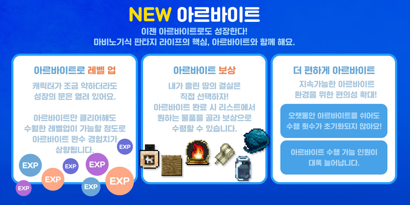 마비노기의 아르바이트 시스템이 개선되었습니다. 특히 아르바이트 보상 시스템이 완전히 개편되었습니다. 보상도 기존보다 다양해졌으며. 특히 경험치를 굉장히 많이 받을 수 있도록 변경되어, 정말 알바만으로도 레벨업이 가능하게 되었습니다. 이번에 새롭게 업데이트된 마비노기 아르바이트 정리해봤습니다