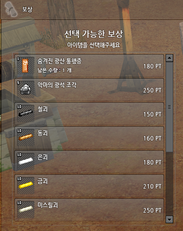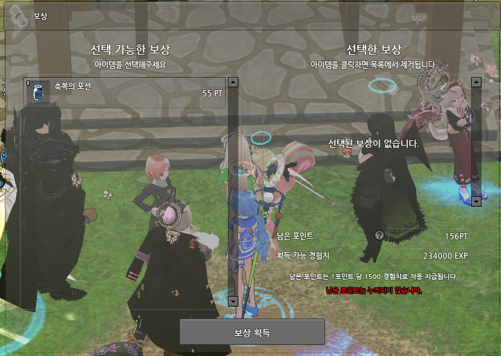 성당알바를 예로 들면 156 포인트를 사용해서 55PT 의 축복의 포션 2개 (110pt) 를 받을 수 있으며, 나머지 46pt는 1PT 당 경험치 1500 으로 환산하여 경험치를 받게됩니다.
