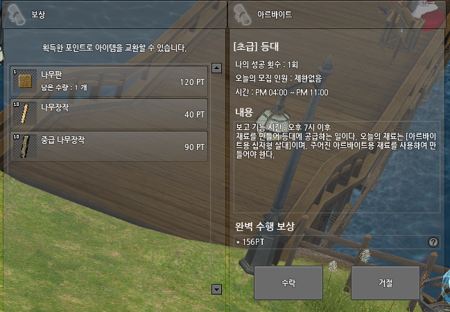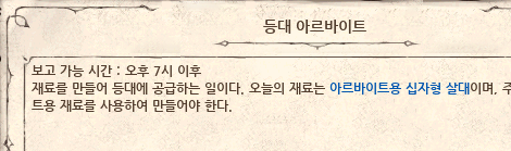 아르바이트 시간 조건이 변경되었습니다. 이제 모든 아르바이트는 23시까지 결과를 보고할 수 있도록 변경되었습니다. 23시 이후에는 진행 중인 아르바이트가 취소되며 보상을 획득할 수 없습니다. 특히, 수주 마감 시간이 추가되어 마감 이후에는 아르바이트를 수주할 수 없습니다.