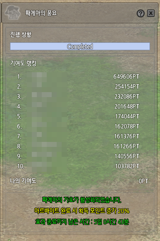 파에아의 풍요, 파에아의 가호는 아르바이트시 포인트를 최대 20% 증가시켜 줍니다. 초급에서도 156pt라는 최대 포인트를 주는데, 서버단위 주간 퀘스트로 고급 알바까지 올라간다면 그 혜택은 꽤나 커질듯 합니다.