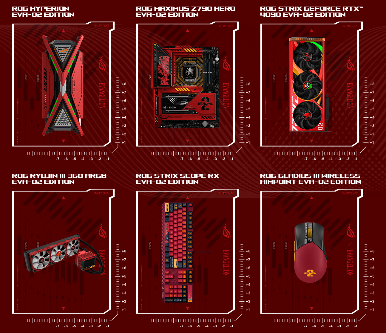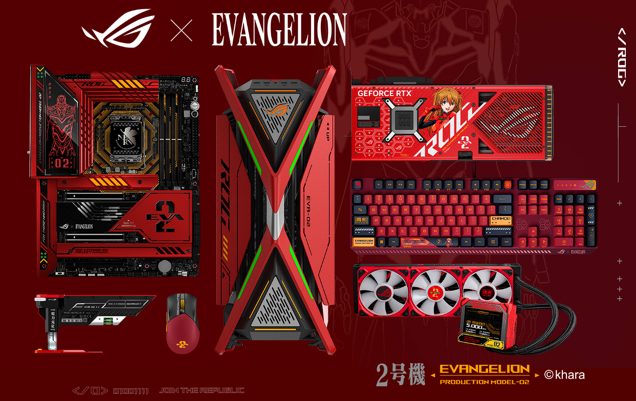 ROG continues the EVANGELION project for gamers with a brand-new machine design centered around EVA-02 and Asuka. The second collection debuted with motherboards, graphics cards, cardholder gaming cases, AIO coolers, peripherals, and gear. Build the full m