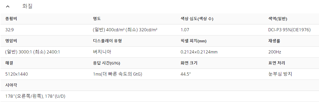 주요 사양은 표시색상 수 약 10.7억색, 밝기 400cd/㎡, 명암비 3,000:1, 시야각 상하/좌우 모두 178도이다.