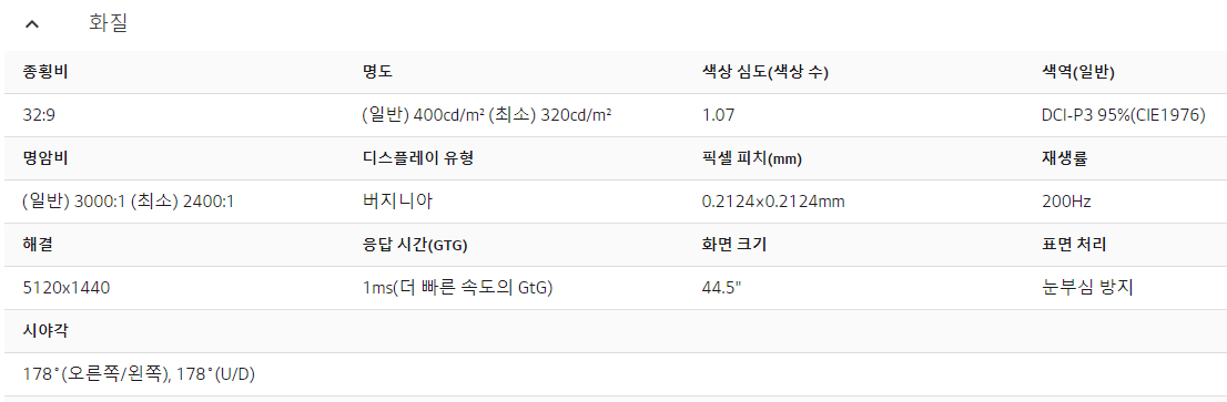 WQHD 패널 2장에 해당하는 5,120×1,440 해상도를 가지는 45인치 비광택 VA 패널을 탑재한 LCD 모니터로 200Hz의 주사율과 1ms의 중간색 응답속도를 지원한다. 색재현도는 DCI-P3 95% 와 DisplayHDR 600을 준수하는 색재현율을 제공한다.