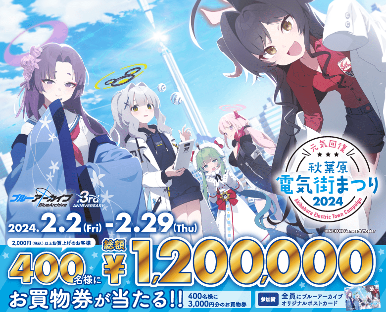 기간은 2월 29일(목)까지. 아키하바라 전기 거리 축제는 아키하바라에서 쇼핑을 한 사람 등에게 금권이나 굿즈 등을 선물하는 연례 캠페인이다.이번은 인기의 스마트폰을 위한 앱 게임 「블루 아카이브」와 콜라보레이션. 대상 점포에서 2,000엔 이상 쇼핑하면 추첨을 통해 400명에게 3,000엔 상당의 쇼핑권이 당첨되는 추첨 추첨을 실시할 예정이다.