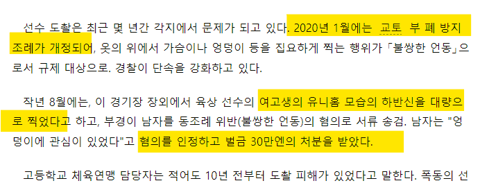 일본에서도 23년 5월이 되어서야 선수 도촬 「アスリート盗撮 - 애슬리트 도촬」 혐의 사건으로 체포되는 것이 발생.