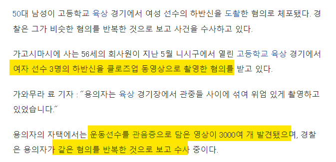 히로시마 사건 자체가 '운동 선수를 대상으로 한 관음증 혐의로 체포'된 것은 일본 내에서 고작 두 번째 사건이라는 것.