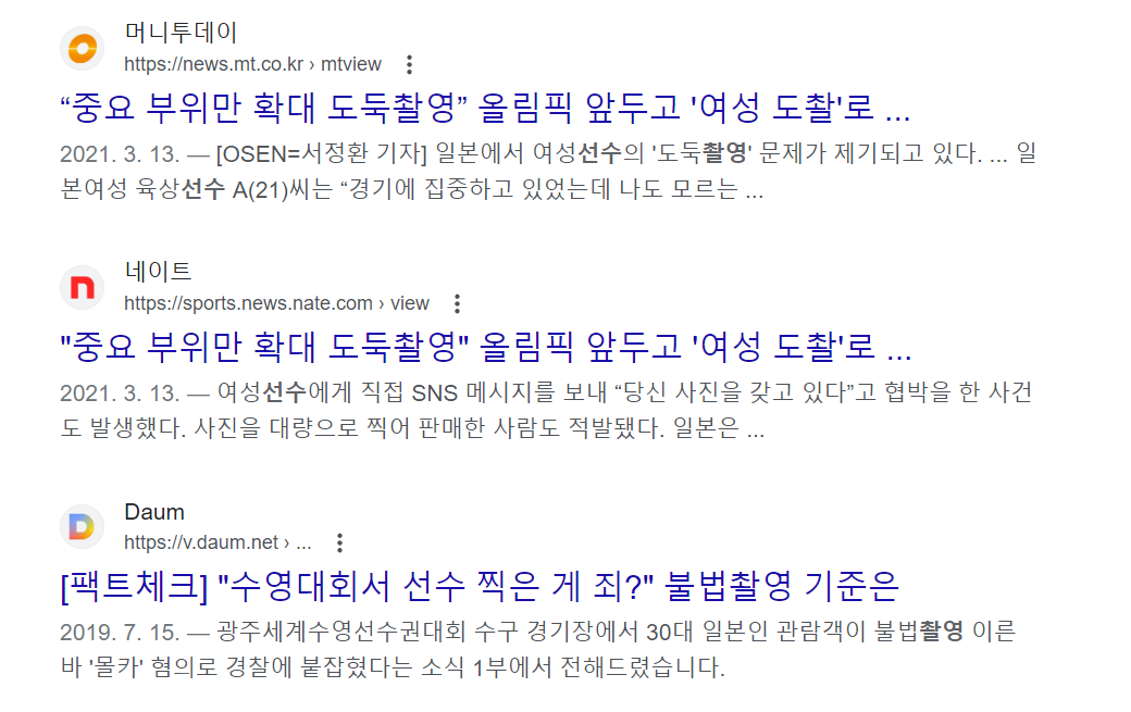 「애슬리트(애슐리트) 도촬」 - 경기중의 선수를 성적인 시선 및 성적인 것을 목적으로 몰래 찍는 행위.