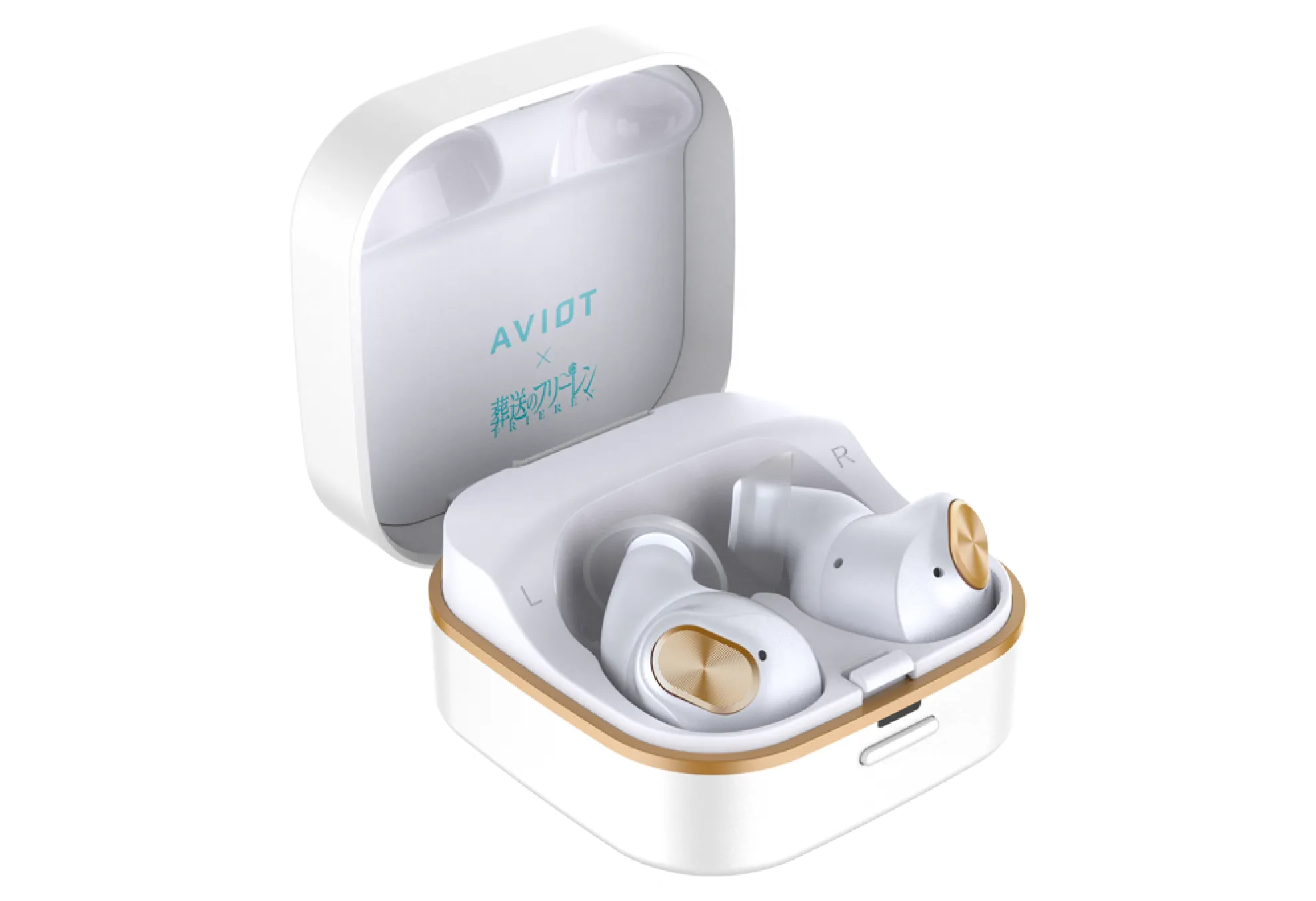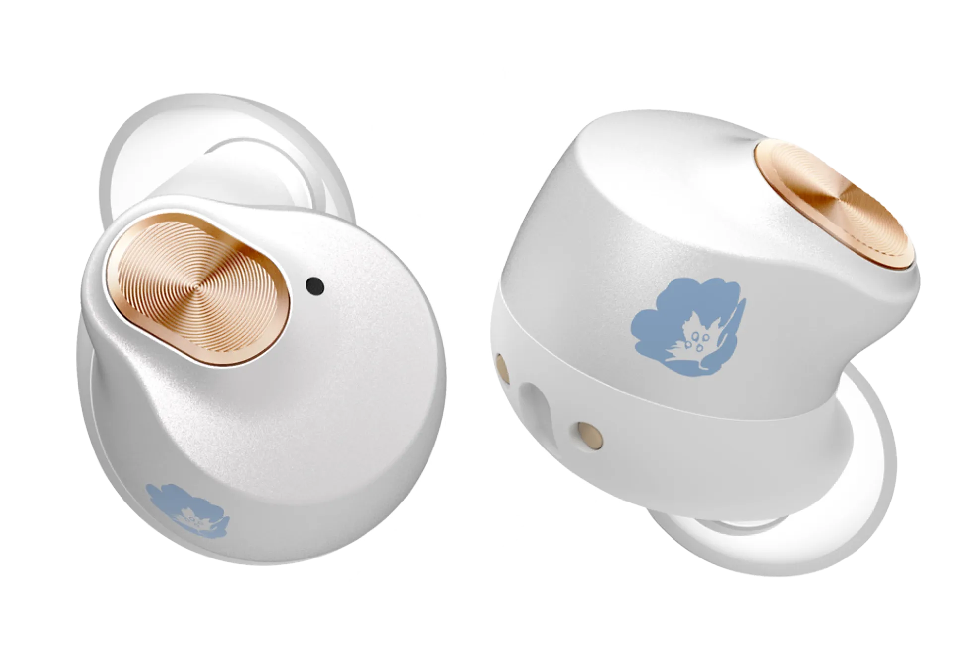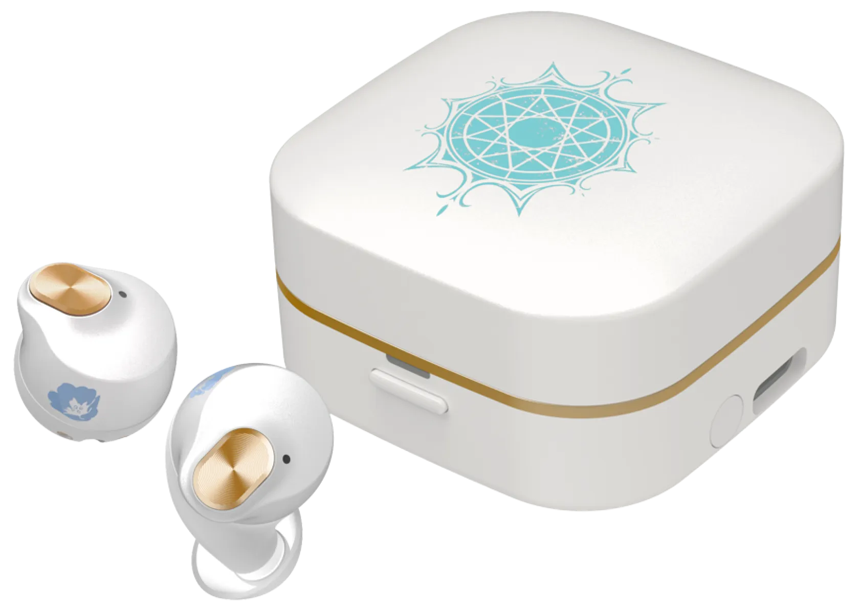 우선 프리랜을 생각나게 하는듯한 깔끔한 흰색 컬러의 케이스가 인상적입니다. 또한 블루투스 이어폰 오른쪽/왼쪽 유닛에는 프리렌과 힘멜의 에피소드 중 하나인 창월초 가 그려져 있는 것을 확인할 수 있습니다.