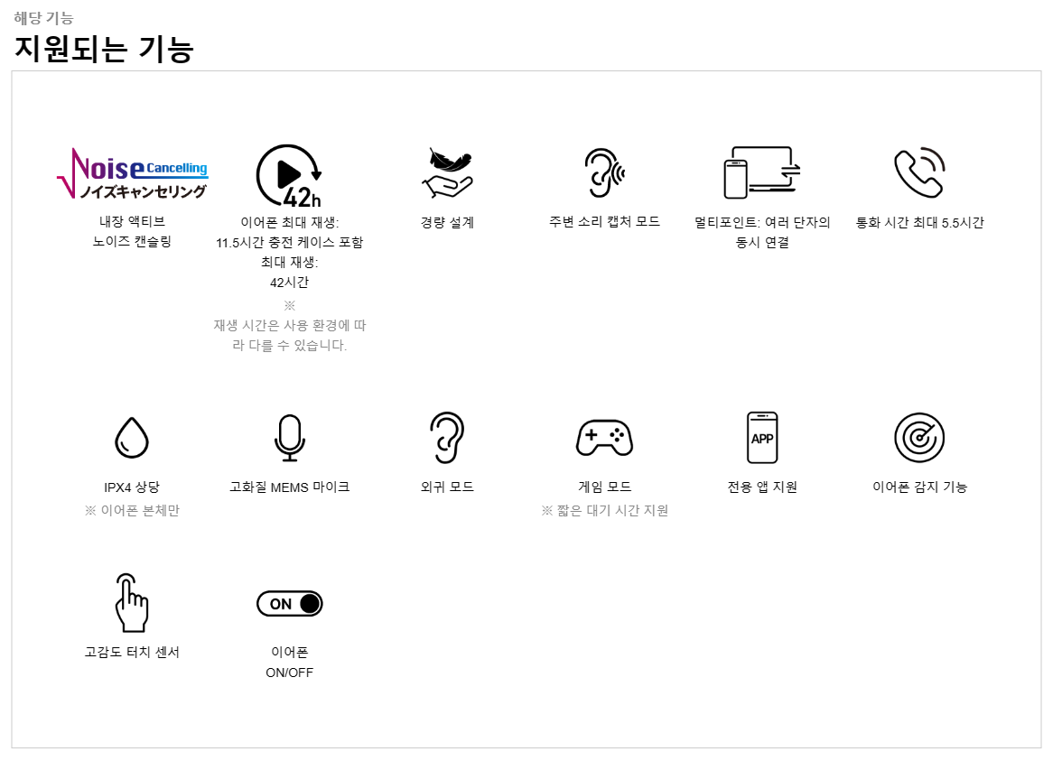 | - 충전 케이스 병용 | 42시간 (사용 환경에 따라 변동 가능) |