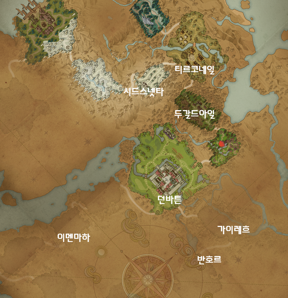 PC 버전 마비노기를 기준으로 던바튼의 위치를 생각해 보면, 던바튼 아래쪽에 반호르가 있고 왼쪽에 이멘마하가 있습니다. 그런데 현재 공개된 지도에서는 던바튼이 티르코네일보다 북쪽에 위치하는 것으로 확인됩니다. 이는 지도를 회전시키면 해결되는 문제입니다.