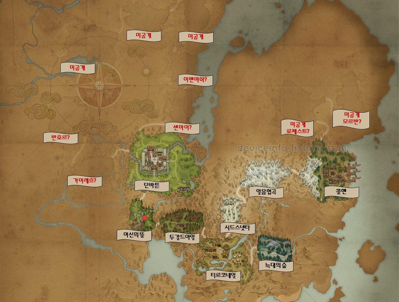현재 마비노기 모바일 월드맵 지도를 기준으로. 아래와 같이 지역들이 추가될 것을 예상할 수 있다.
