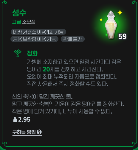 성수는 검은 덩어리를 정화해 주는 고급 소모품 아이템이에요.