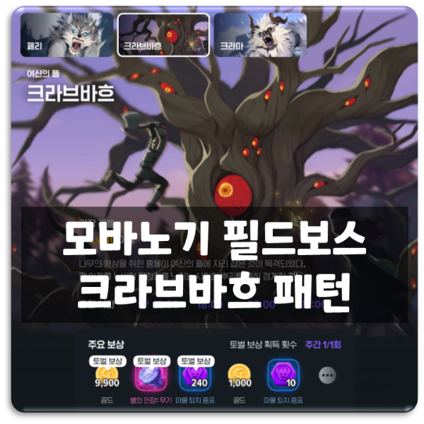 모바노기 모바일에서 레벨 40부터 참여가능한, 필드보스 중 하나인 여신의 뜰 크라브바흐 에 대한 스킬 패턴을 분석한 글입니다. 간단한 패턴이지만 몇가지 스킬은 파악하고 대응하는 것이 중요합니다.
