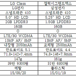 반응형 class1 Lg 클래스 공식 사양 발표 엘지의 저가형, 보급형 스마트폰인 LG CLASS의 공식 사양에 대한 발표와 함께 출고가도 결정 되었습니다. 기존의 40만원 가격대에 형성될 것이라는 우려와 달리, 지난번에 혹시나 했던 것처럼 정확히 39만 9300원이라는... ㅡㅡ 가격에 측정되었습니다. 이걸 맞추네 해당 기기에 대한 스펙 발표와 동시에 인터넷 커뮤니티 뽐뿌에서 'kobo'님께서 현재 가장 핫한 제품인 루나와의 스펙 비교를 해주셨는데요 후앙...... 남다른 CLASS를 보여준다고 하더니, 이게 CLASS인가 싶네요 루나폰과 같은 저가형 보급폰을 기대했는데, 살짝 기대에 못 미치는 성능입니다. 뭣보다 5.0인치의 액정크기와, 내장형 2050mAh라는 밸터리 용량이 많은 면에서 아쉽네요. http://m.ppomppu.co.kr/new/.. 일상 글/인포메이션 2015. 9. 21. 이전 1 다음 추천 글 반응형
